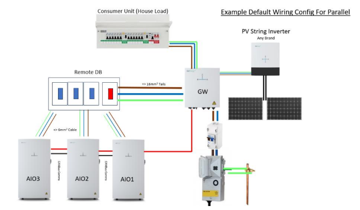 The AC supplies of each AIO are connected into the Gateway via their own 6mm cable and individual RCBO. The Communications cable from the Gateway connected to AIO1 (Master). From AIO1 there is 2 x RJ45 cables to AIO2 and if a 3rd unit fitted, a further 2 from AIO2 to AIO3.